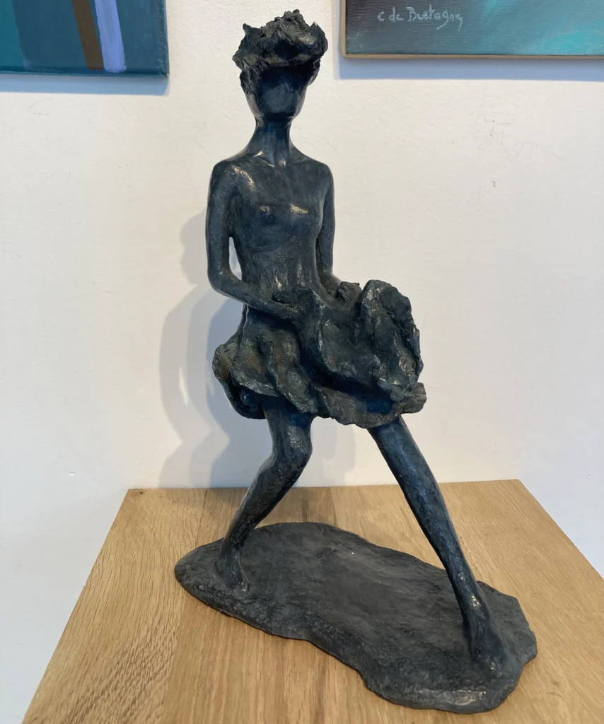 D’après mon imagination, j’ai modelé cette jeune fille est lancée résistant au vent avec cheveux et robe balayes par le vent.