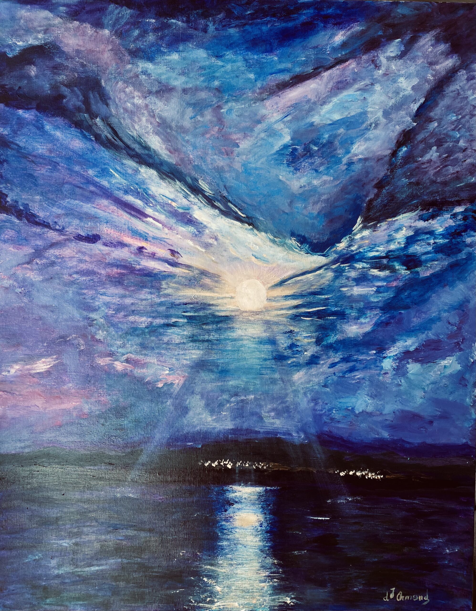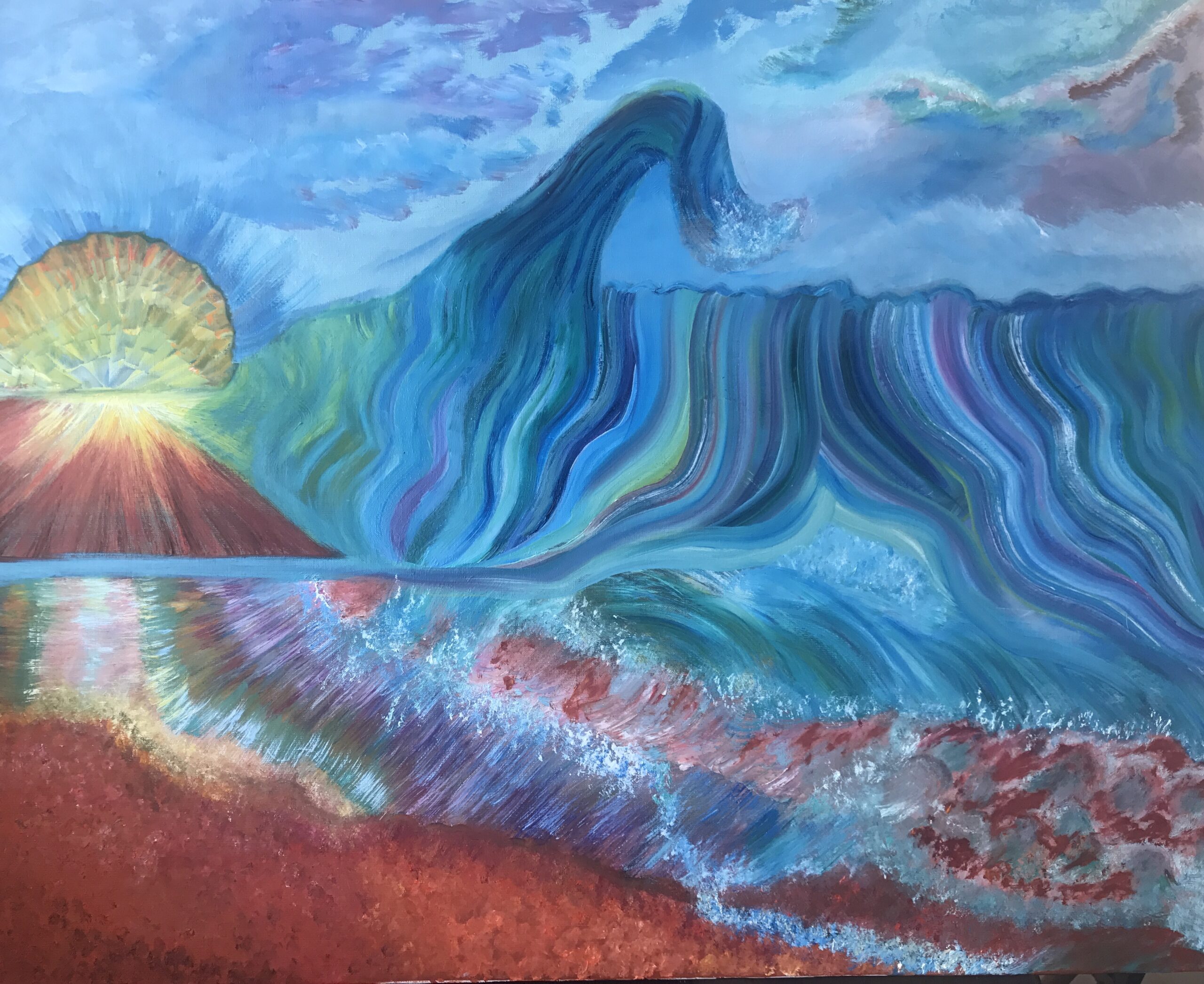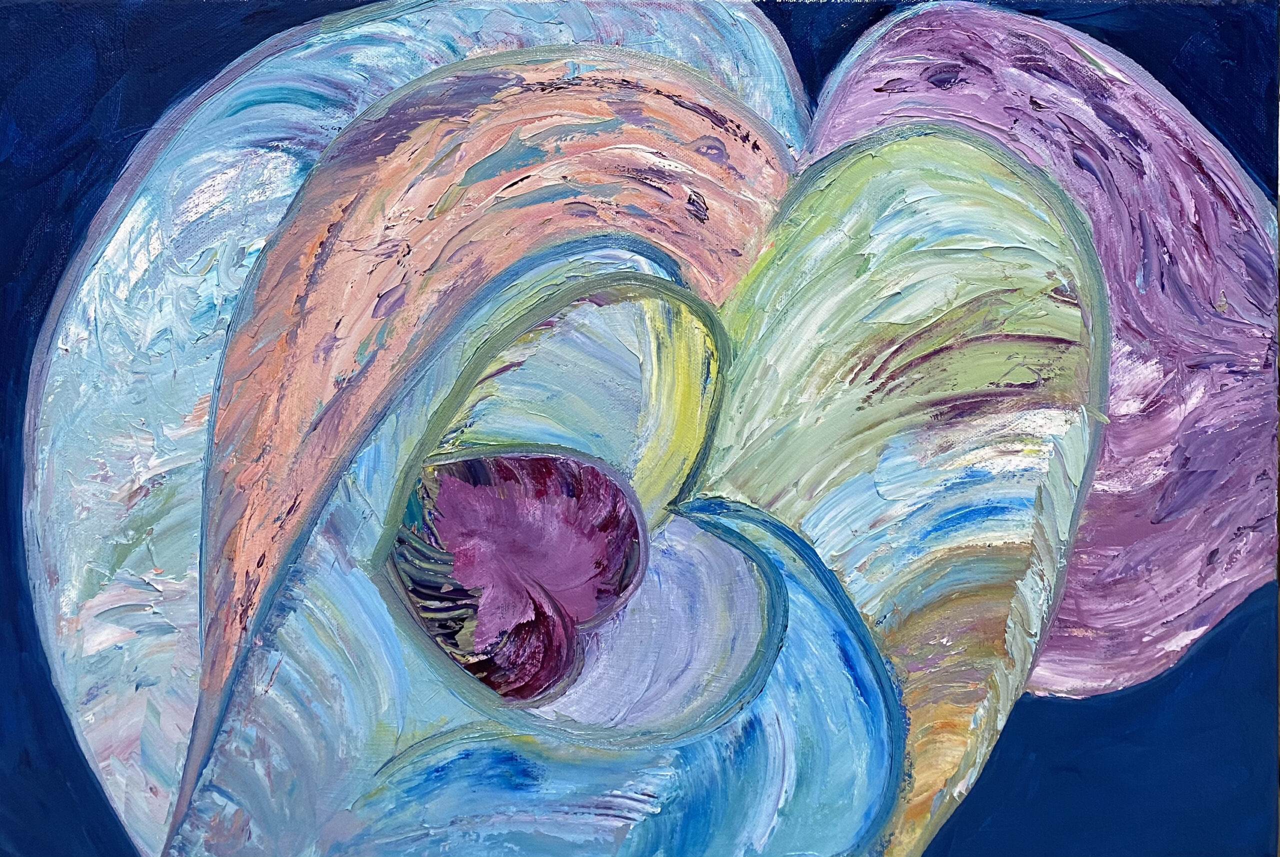 D'une sensibilité extrême et très influencée spirituellement par ses 9 années de vie en Asie, ses premières toiles spirituelles ont voulu exprimer "l'âme" avec tout son mystère ; puis la violence actuelle a réveillé les douleurs enfouies en elle, de la guerre qu'elle a exprimé par ses couleurs vives voir violentes.