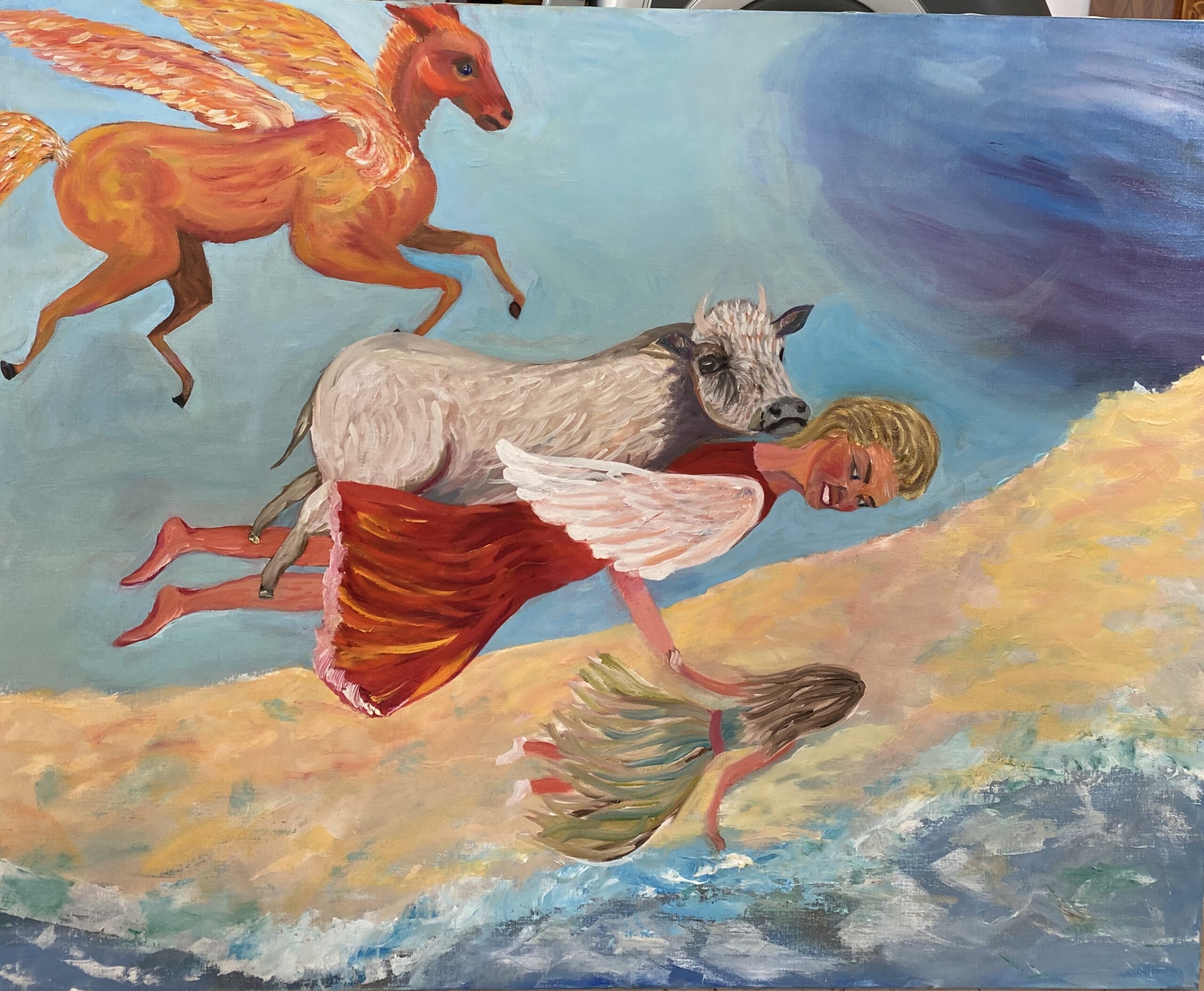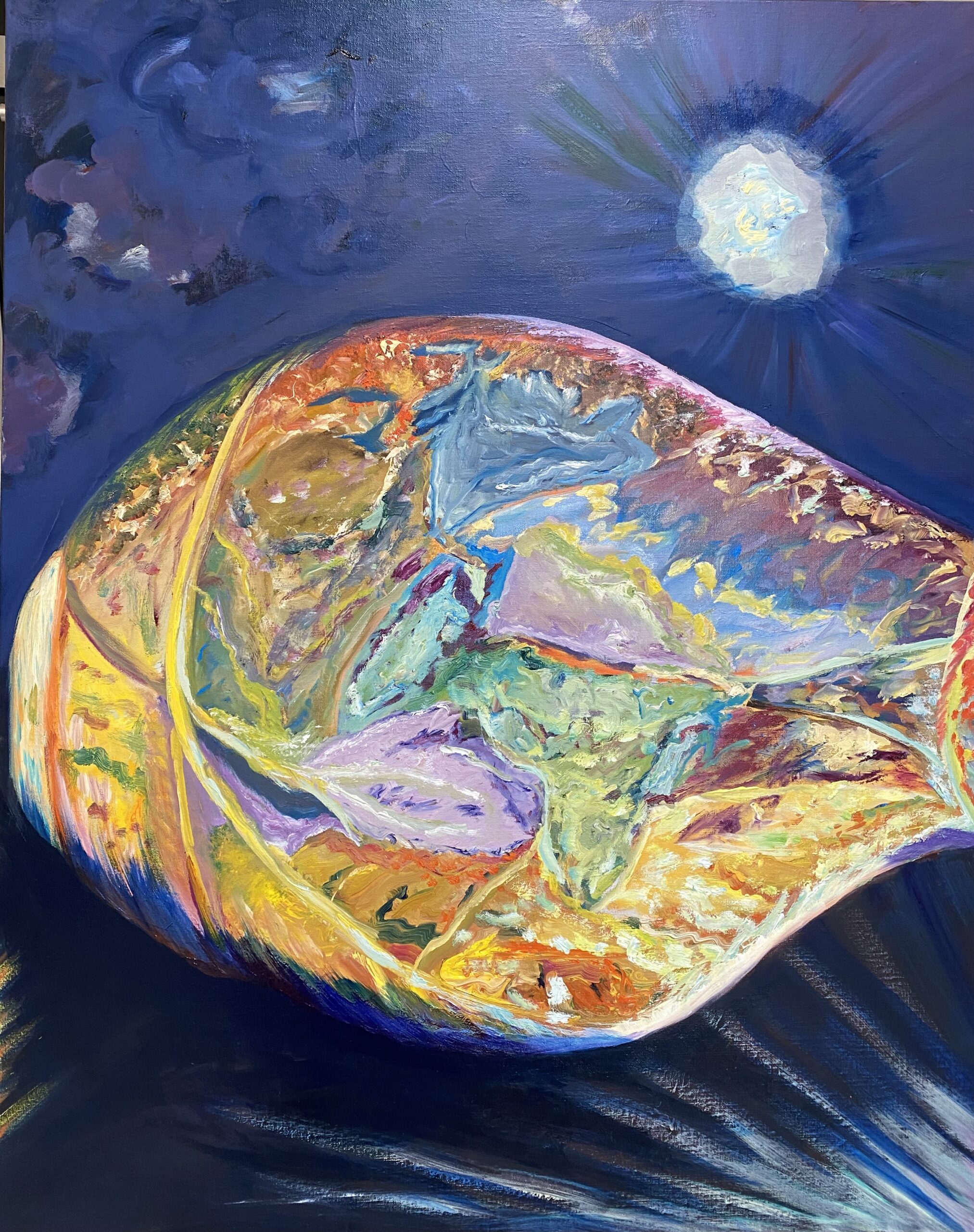 Elle a adopté une technique originale pour l’acrylique : elle travaille avec les doigts ; elle sculpte en quelque sorte la peinture avant de la poser sur la toile.